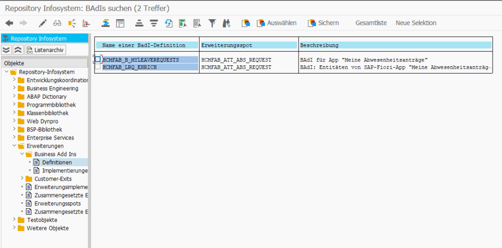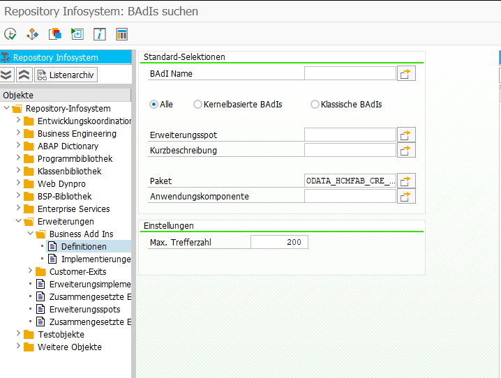 ABAP [ABAP] Find BAdI in package December 13, 2025 December 10, 2025 abap, BAdI, HR, SAP, SE84 SE84 → Enter Package Name, e.g. ODATA_HCMFAB_CRE_LRQ [ABAP] Selektionsparameter mit Suchhilfe für Personalnummern Leave a Reply Cancel replyYour email address will not be published. Required fields are marked *CommentName* Email* Website Save my name, email, and site URL in my browser for next time I post a comment.