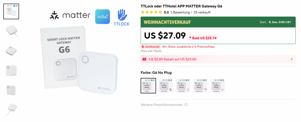 Additionally, in some comments that I don’t find anymore, someone wrote that the new G6 Hub supports Matter, and this way the lock can be added locally to Home Assistant, instead of the TTLock Cloud based service. But only one lock per Hub can be published via Matter. I found no information what entities will be published by the Hub via Matter. That’s why I ordered one and tested myself.