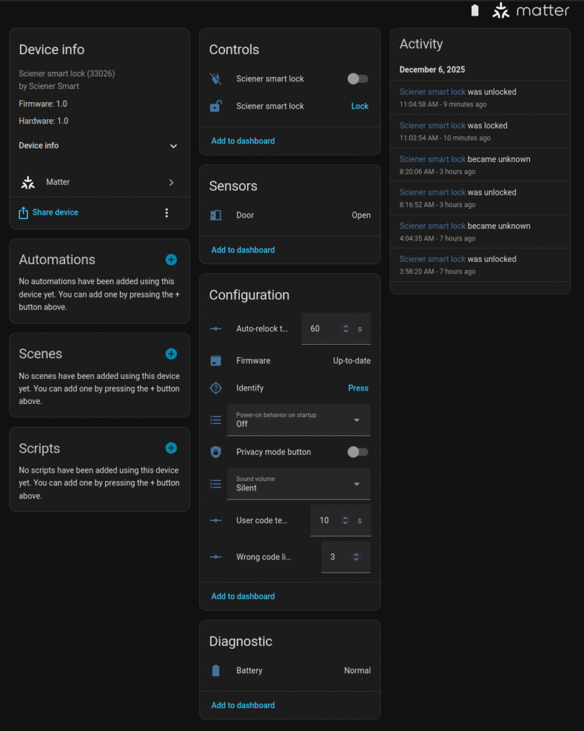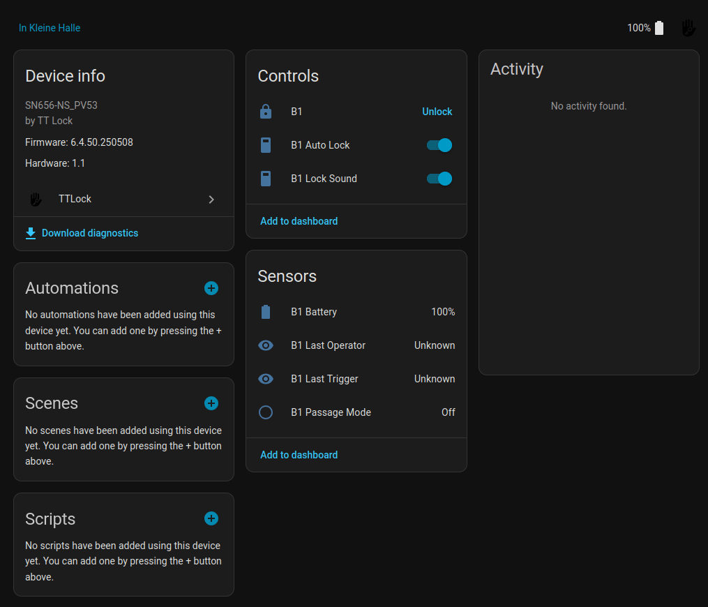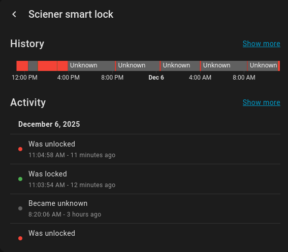 This looked promising, but it turned out, nothing ever gets updated…. the only thing that updates occasionally is the lock.sciener_smart_lock control (second control in the screenshot), but most of the time it is in status unknown. Not sure what is going on here, but even is the status is not unknown, it stays in the status “unlocked” most of the time, even if the lock is currently locked. However, it is possible to unlock the door via Home Assistant, but most of the time you first have to hit Lock, although it is already locked, and then Unlock. But in daily use, you would rarely open the lock via Home Assistant anyway, as using the fingerprint is much quicker. However, for me, it was more important to monitor who and when unlocked the door, but this information is not provided.